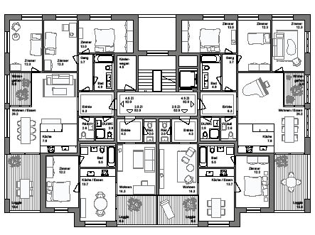 Alle Wohnungen basieren auf einem einheitlichen Prinzip, jedoch unterscheiden sie sich in ihrer Ausgestaltung . Jede Wohnung wird über ein geräumiges Entrée betreten. Als Verteiler werden von da aus verschiedene Räume mit unterschiedlichen Türgrössen direkt erschlossen. Die grosszügigste Öffnung führt in den Wohn-Ess-Raum mit Loggia und Wintergarten. Die Wohnungen sind flexibel nutzbar, da alle Zimmer eine angemessene Grösse aufweisen und gut möblierbar sind.
